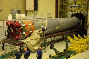 La partie inférieure du corps central du lanceur Soyouz 2.1 est extraite du wagon de transport. Alors que Progress MS-14 vient juste de rejoindre l’ISS le 25 avril, à Baïkonour on commence à préparer le lancement suivant (en juillet): il s’agira, là encore d’un cargo, le Progress MS-15. Celui-ci est en conditions de stockage dans … Lire la suite de Le lancement de Progress MS-15 déjà en préparation