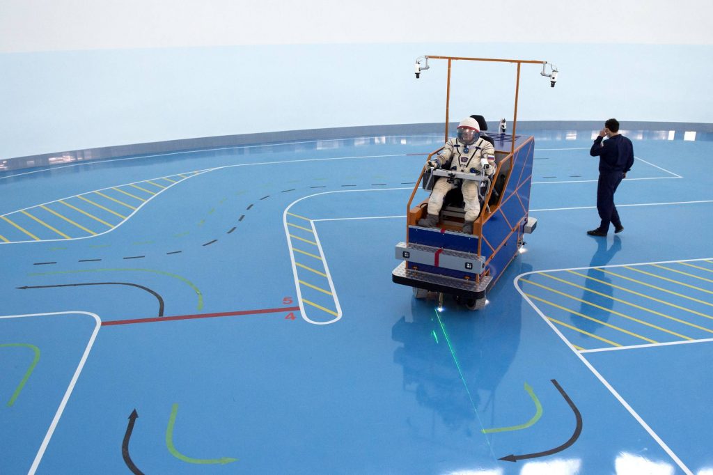 Le « rover » dans le hall de la centrifugeuse. Ceux qui nous suivent attentivement se rappelleront que nous avions repéré sur une photo d’entraînement des cosmonautes sur une des centrifugeuses du TsPK, de curieux tracés au sol, comme si un circuit de voitures pour enfants avait été construit dans cette enceinte. On imaginait une opération de … Lire la suite de Le mystère des pistes tracées dans la salle de la centrifugeuse du TsPK éclairci !