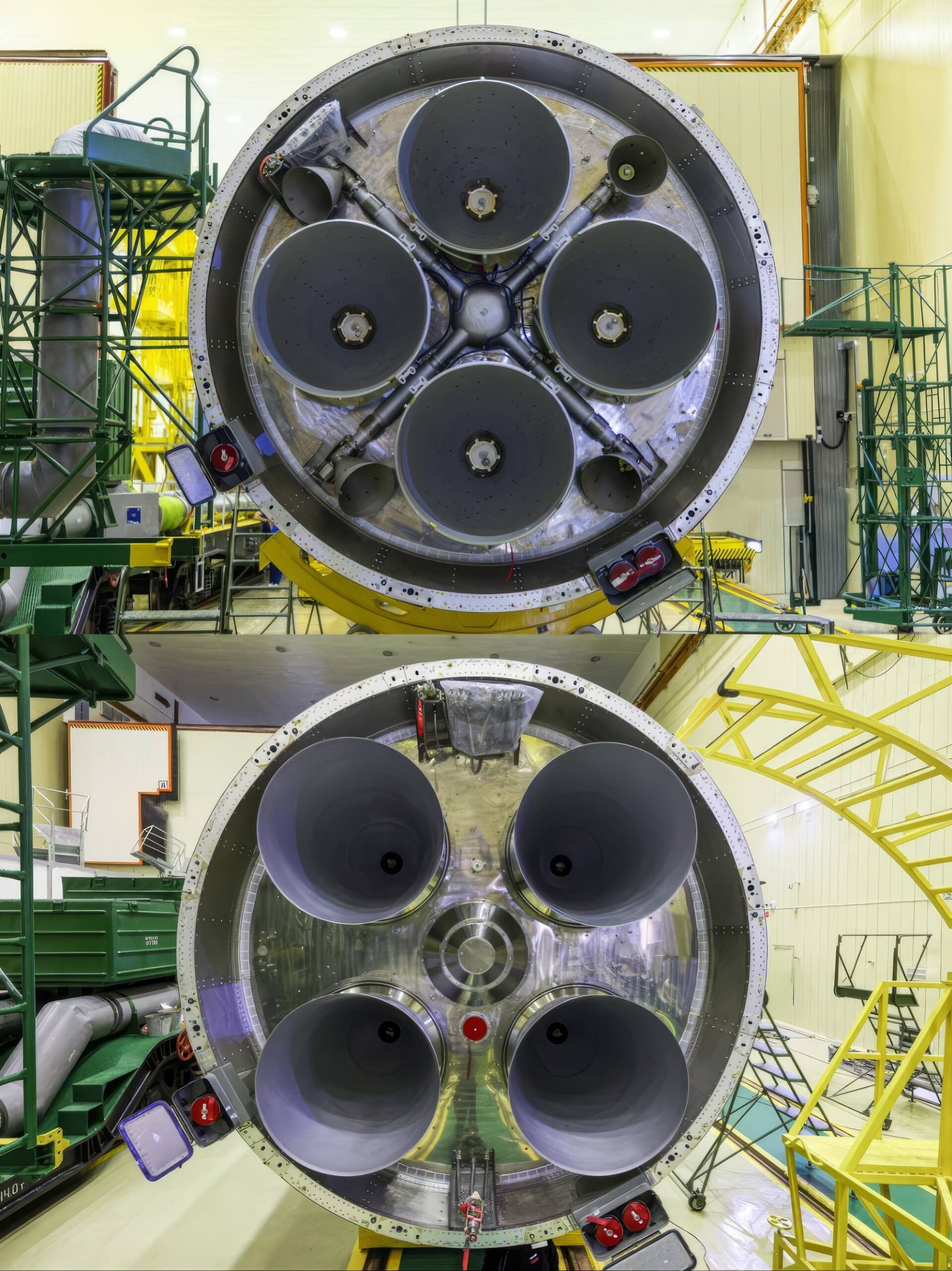 Comparaison des deux moteurs. En haut le RD-0110. Avec ses quatre tuyères Vernier rotatives (de quelques degrés) qui assurent "l'orientation" de l'étage (attitude, et donc sa trajectoire). Sur le moteur RD-0124 ces Vernier n'existent pas: ce sont les moteurs (parties chambres de combustion - tuyères) qui peuvent varier leur angle par rapport à l'axe de l'étage et ainsi assurer l'attitude. Notez que ces ensembles ont été écartés les uns des autres (pour permettre la variation d'angle) et que le moteur a subi une rotation de 45° par rapport à la structure de l'étage.