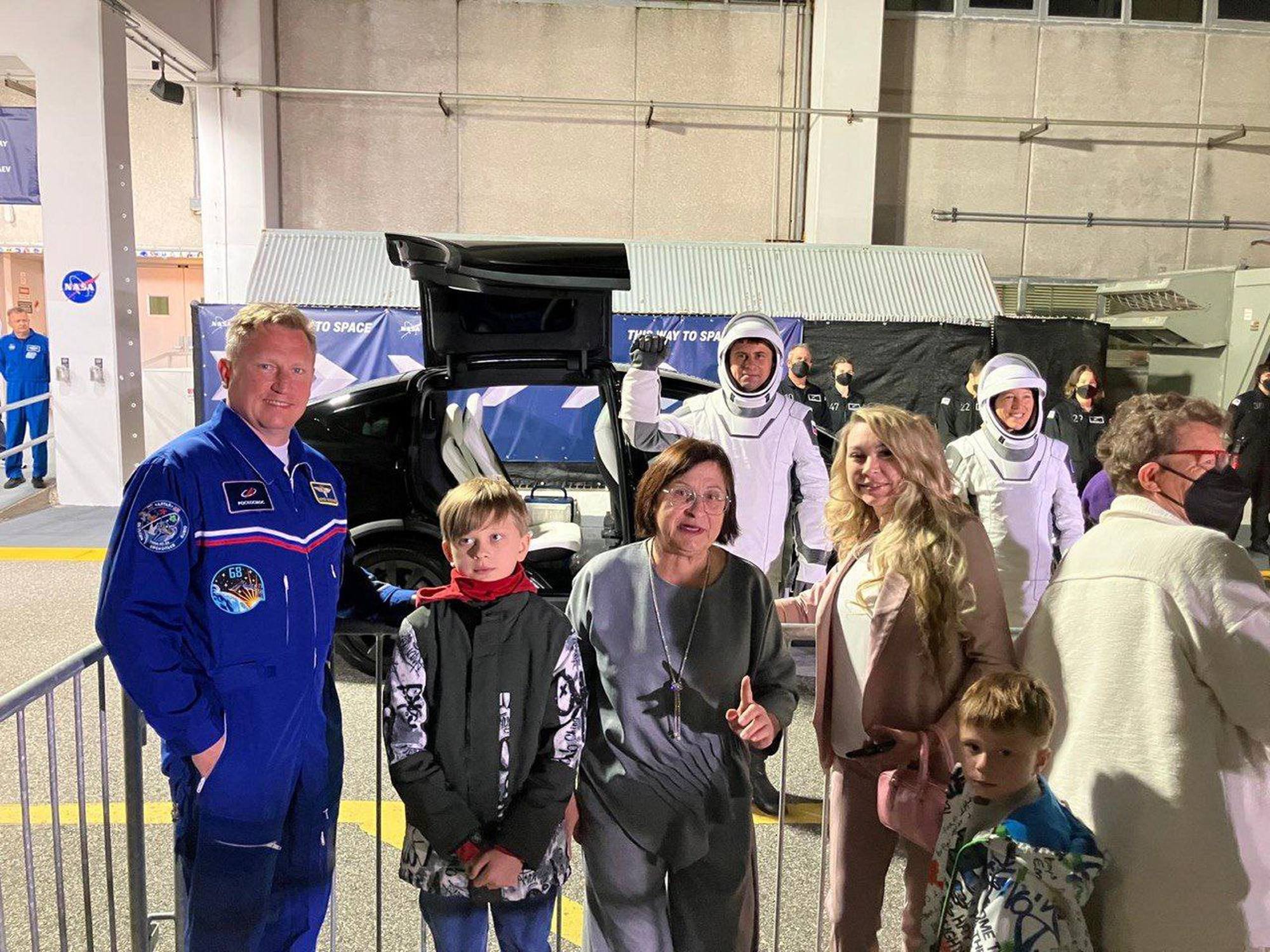 Andreï Fedyayev et ses accompagnants: le cosmonaute Sergueï Prokopyev et la famille de Fedyayev. A côté de Fedyayev, Sophie Adenot.