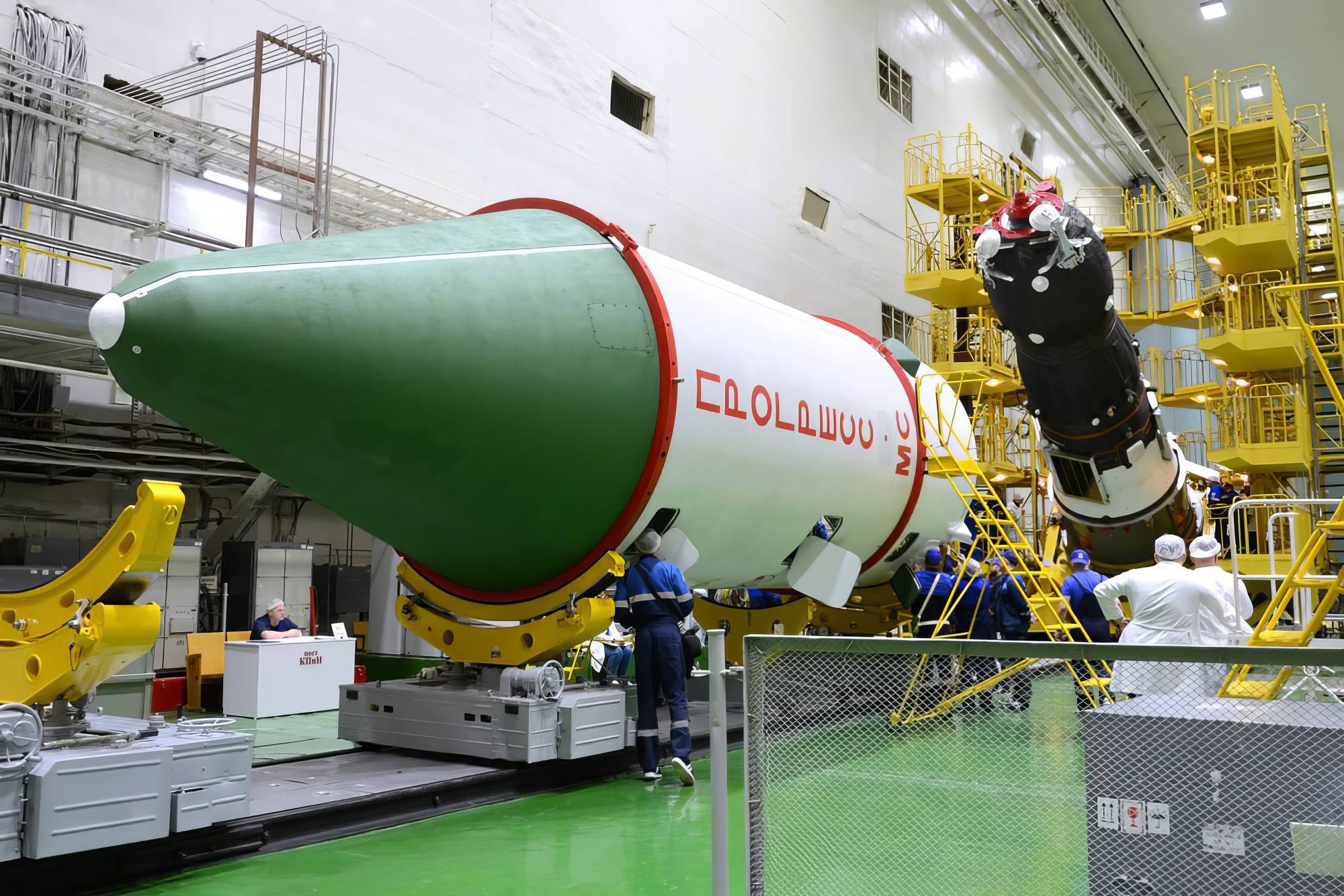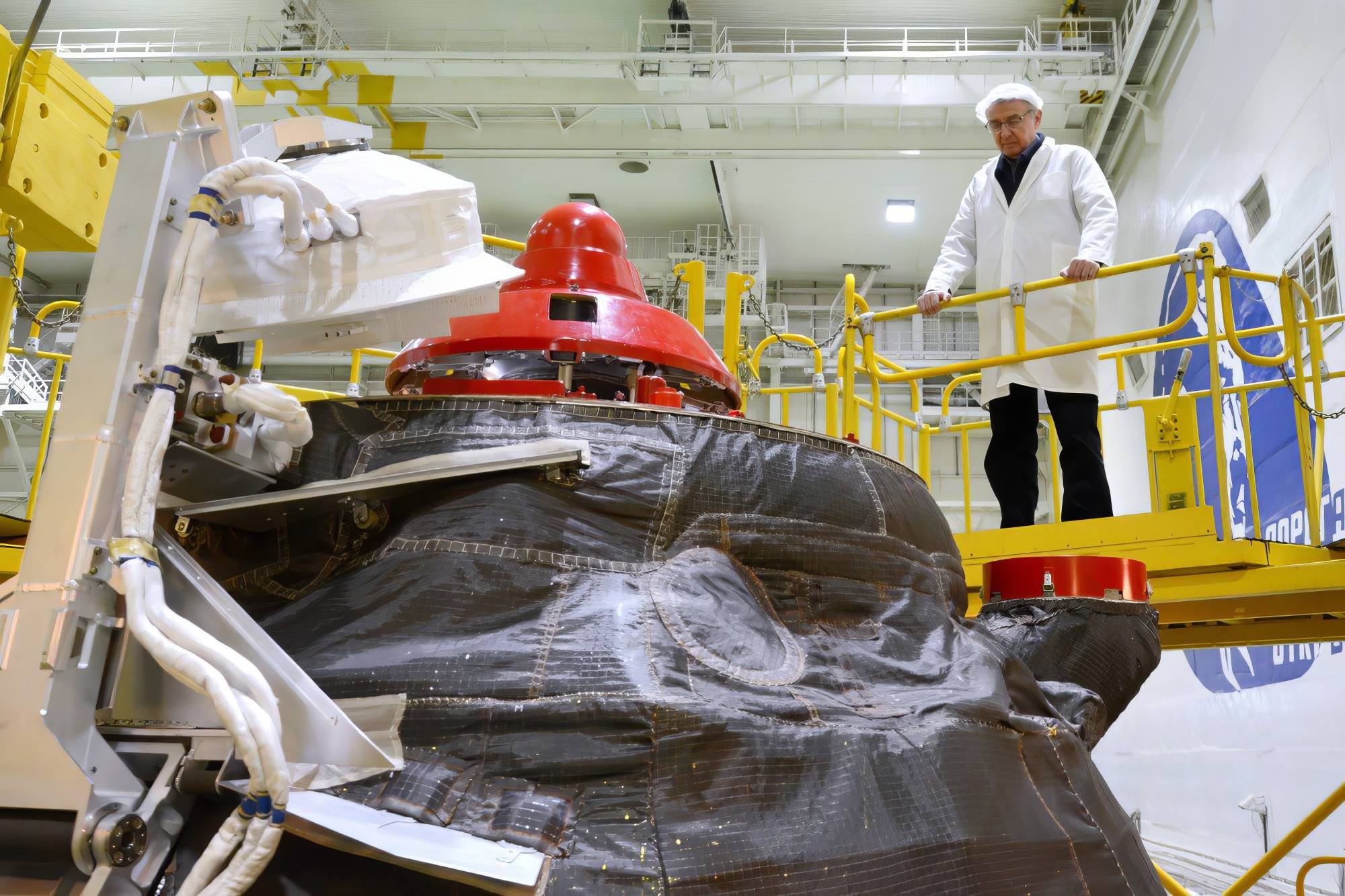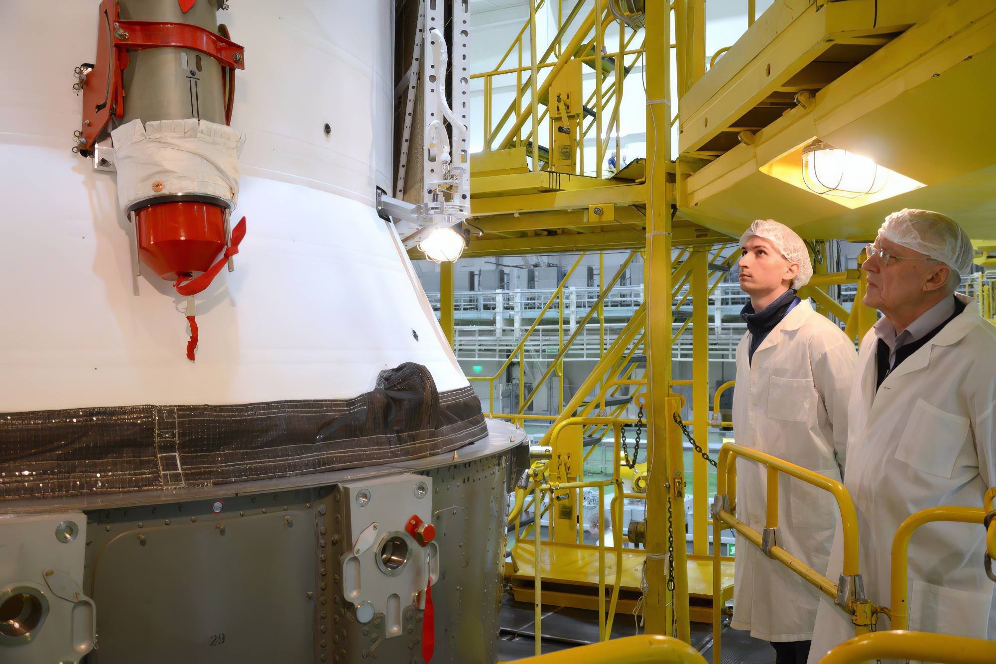 Avant de placer le vaisseau sous la coiffe protectrice, les spécialistes de RKK Energuya ont procédé à une dernière inspection visuelle minutieuse de tous les équipements. Après cette opération, retirer le vaisseau de la coiffe n'est pas impossible, mais cela perturberait le lancement.