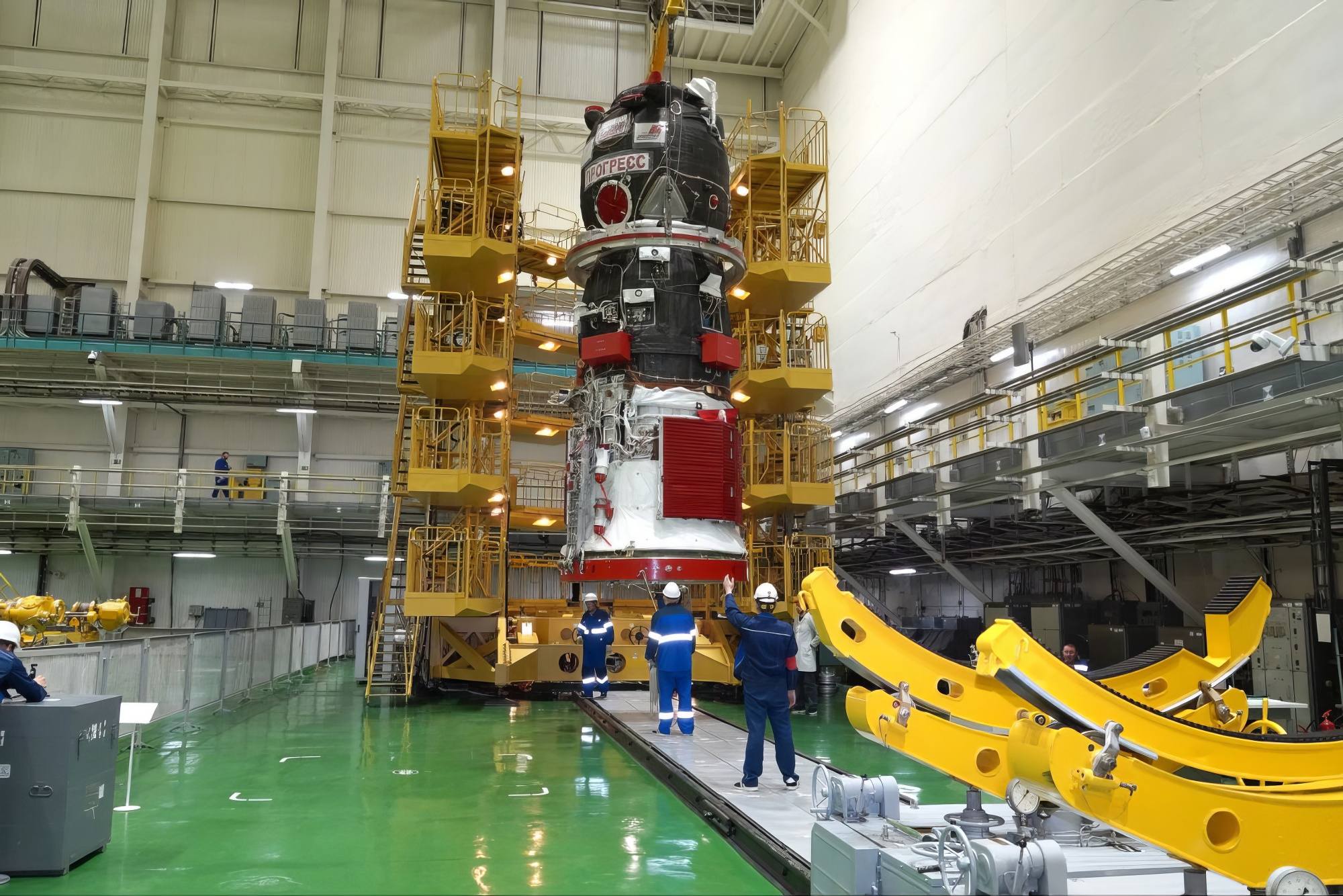 Après ces tests, le vaisseau cargo a été ramené sur son stand de préparation et connecté aux équipements de test au sol pour poursuivre les préparatifs de vol.