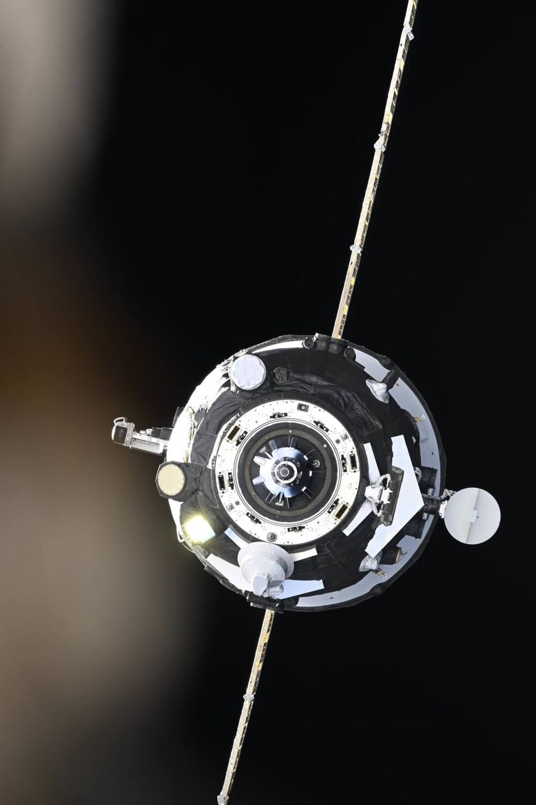 Grâce au cosmonaute Sergueï Koud-Svertchkov, qui a réalisé l'arrimage en mode manuel, on a pu également bénéficier de belles photos du cargo Progress MS-33 approchant de l'ISS avec son antenne non déployée.