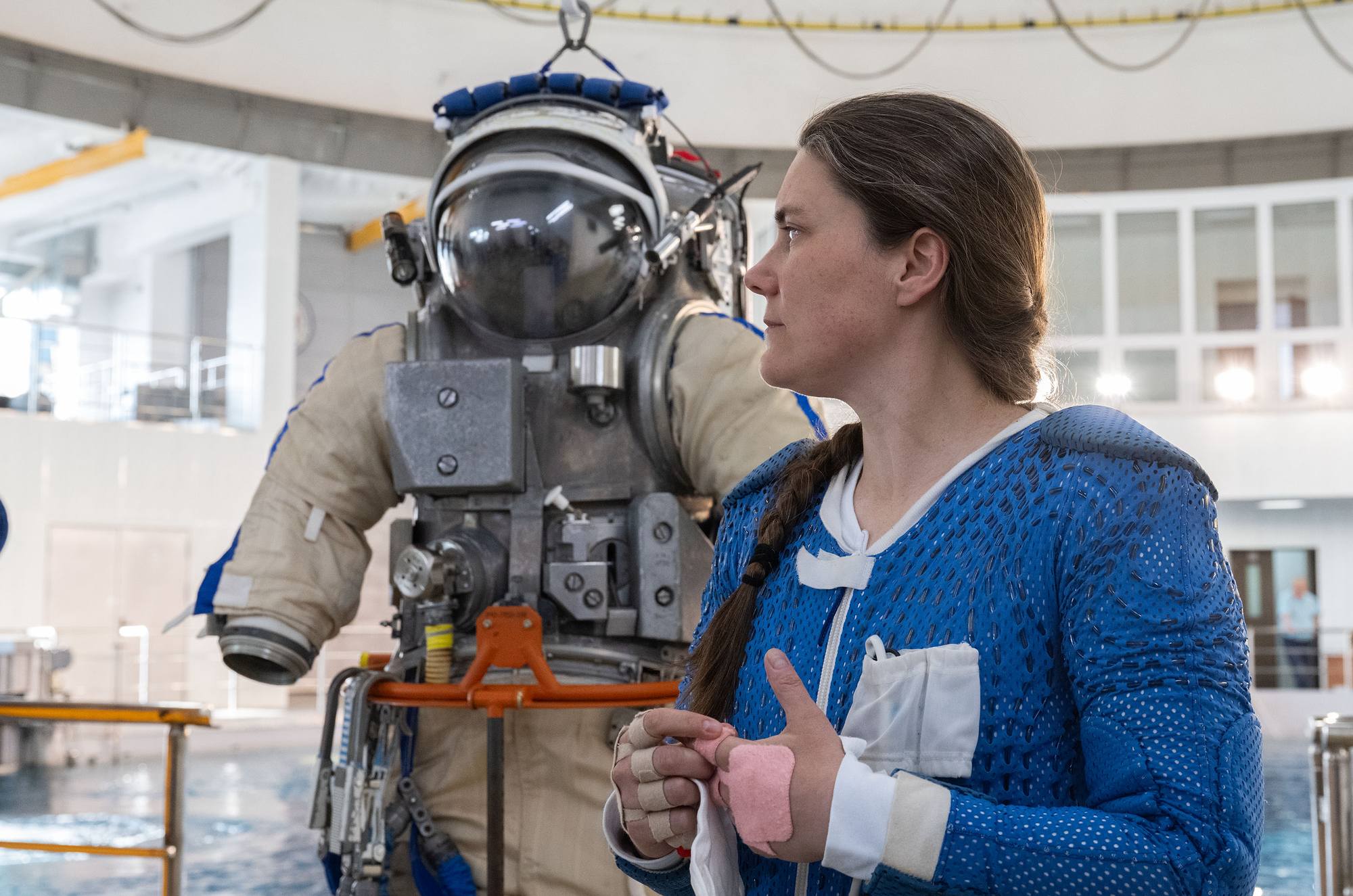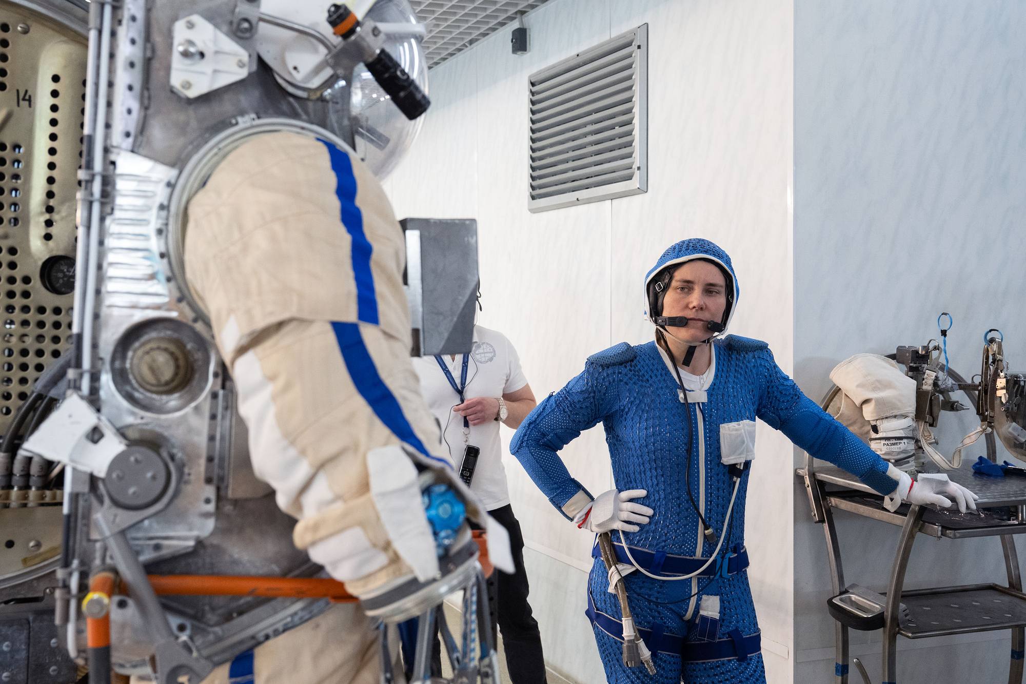 Anna Kikina habillée pour entrer dans le scaphandre. Remarquez sur le dessus des mains et aux épaules les protections rembourrées pour limiter le frottement dans le scaphandre Orlan. L'habit bleu est essentiellement un système de régulation thermique où circule un liquide.